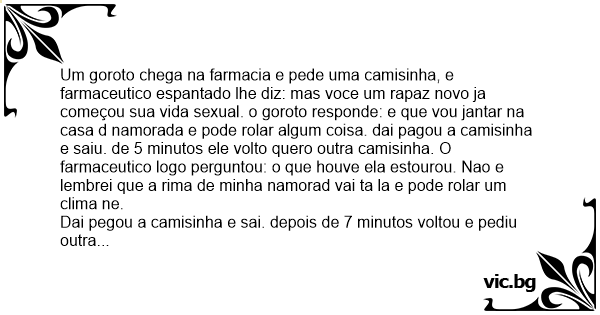 Um goroto chega na farmacia e pede uma camisinha, e farmaceutico espantado lhe diz: mas voce um rapaz novo ja começou sua vida sеxuаl. o goroto responde: e que vou jantar na casa d namorada e pode rolar algum coisa. dai pagou a camisinha e saiu. de 5 minutos ele volto quero outra camisinha. O farmaceutico logo perguntou: o que houve ela estourou. Nao e lembrei que a rima de minha namorad vai ta la e pode rolar um clima ne.