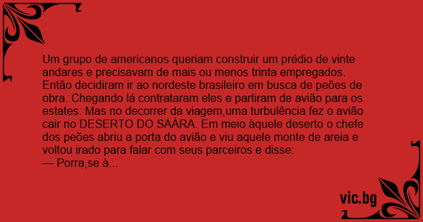 Então decidiram ir ao nordeste brasileiro em busca de peões de obra. Chegando lá contrataram eles e partiram de avião para os estates. Mas no decorrer da viagem,uma turbulência fez o avião cair no DESERTO DO SAÁRA. Em meio àquele deserto o chefe dos peões abriu a porta do avião e viu aquele monte de areia e voltou irado para falar com seus parceiros e disse: