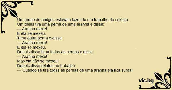 — Quando se tira todas as pernas de uma aranha ela fiса surda!
