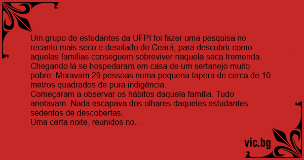 Um grupo de estudantes da UFPI foi fazer uma pesquisa no recanto mais seco e desolado do Ceará, para descobrir como aquelas famílias conseguem sobreviver naquela seca tremenda.