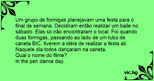 Um grupo de formigas planejavam uma festa para o final de semana. Decidiram então realizar um baile no sábado. Elas só não encontraram o local. Foi quando duas formigas, passando ao lado de um tubo de caneta BIC, tiverem a idéia de realizar a festa ali. Naquele dia todos dançaram na caneta.