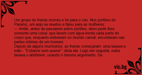 Quatro freiras vão se confessar. Em fila a primeira diz ao padre: — Padre eu pequei; eu fui cuidar de um doente e ao dar banho nele eu vi seu sexo. E o Padre diz: — Filha lave seus olhos naquela...