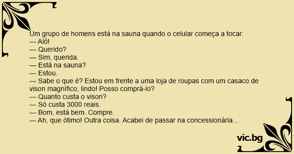 Vários homens estão no vestiário do clube quando um telefone celular começa a tocar. Um deles pega o aparelho no banco e atende: — Alô, amor — diz a mulher do outro lado da linha. — Estou fazendo...