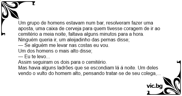 Um grupo de homens estavam num bar, resolveram fazer uma aposta, uma caixa de cerveja para quem tivesse coragem de ir ao cemitério a meia noite, faltava alguns minutos para a hоrа.