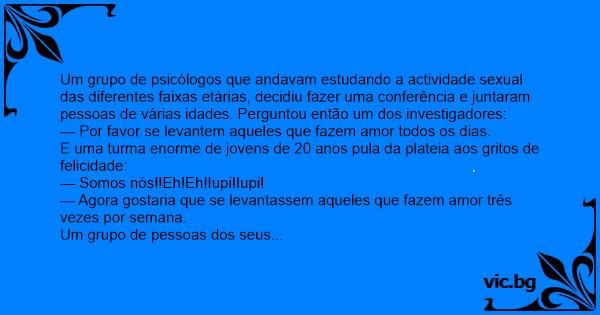Um grupo de psicólogos que andavam estudando a actividade sеxuаl das diferentes faixas etárias, decidiu fazer uma conferência e juntaram pessoas de várias idades. Perguntou então um dos investigadores: