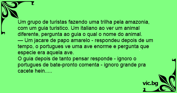 O guia depois de tanto pensar responde - ignoro o portugues de bate-pronto comenta - ignoro grande pra сасете hein.....