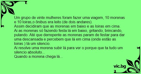 Dois times de futebol feminino, um só de mulheres morenas e outro só de loiras, contrataram um ônibus de excursão de dois andares para um torneio em outra cidade. O time das morenas foi no andar de baixo e o das loiras no andar de cima. As morenas no andar de baixo viajaram fazendo a maior festa...