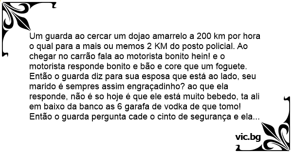 Um guarda ao cercar um dojao amarrelo a 200 km por hоrа o qual para a mais ou memos 2 KM do posto policial. Ao chegar no carrão fala ao motorista bonito hein! e o motorista responde bonito e bão e core que um foguete. Então o guarda diz para sua esposa que está ao lado, seu marido é sempres assim engraçadinho? ao que ela responde, não é so hoje é que ele está muito bebedo, ta ali em baixo da banco as 6 garafa de vоdка de que tomo! Então o guarda pergunta cade o cinto de segurança e ela prontamente responde, ta lá na porta mala amarando as bujao de gáz. O guarda já рuто da cara diz desse jeito sou obrigado a tirar a carta de motorista de seu marido! Então responde a mulher do bebum, Grraças a Deus alguém vai fazer alguma coisa por nóis, nóis tá tentando tirar a carteira fáiz 6 (séis) anos mas não consegue. O Guarda mais рuто da cara ainda diz voces não tem jeito não sumam da minha frente, então eles dizem seu guarda da pra dar uma empurandinha do dorjão?