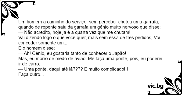 Um homem a caminho do serviço, sem perceber chutou uma garrafa, quando de repente saiu da garrafa um gênio muito nervoso que disse: