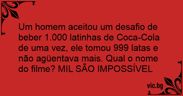 Um homem aceitou um desafio de beber 1.000 latinhas de Coca-Cola de uma vez, ele tomou 999 latas e não agüentava mais. Qual o nome do filme? MIL SÃO IMPOSSÍVEL