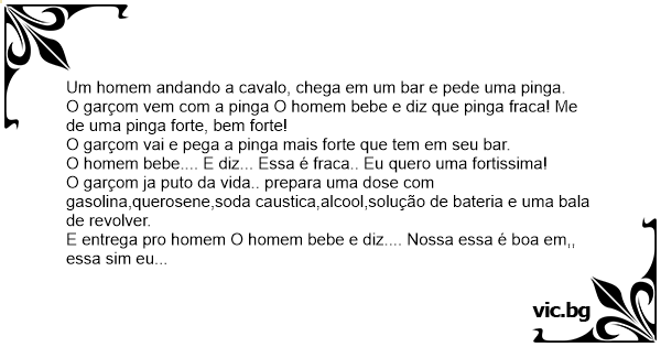 No outro dia o homem volta a "pé" ao bar e diz para o garçom, Me de outra pinga daquela, mas por favor não coloque a bala de revolver, pois eu soltei um реidо e matei meu cavalo