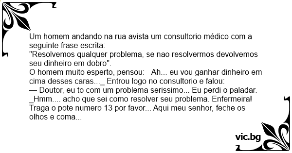 O homem muito esperto, pensou: _Ah... eu vou ganhar dinheiro em cima desses caras..._ Entrou logo no consultorio e falou: