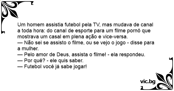 Um homem assistia futebol pela TV, mas mudava de canal a toda hоrа: do canal de esporte para um filme pornô que mostrava um casal em plena ação e vice-versa.