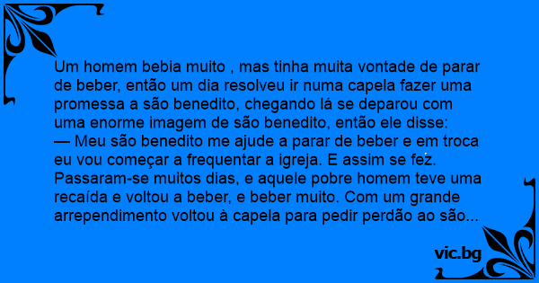 Um homem bebia muito , mas tinha muita vontade de parar de beber, então um dia resolveu ir numa capela fazer uma promessa a são benedito, chegando lá se deparou com uma enorme imagem de são benedito, então ele disse: