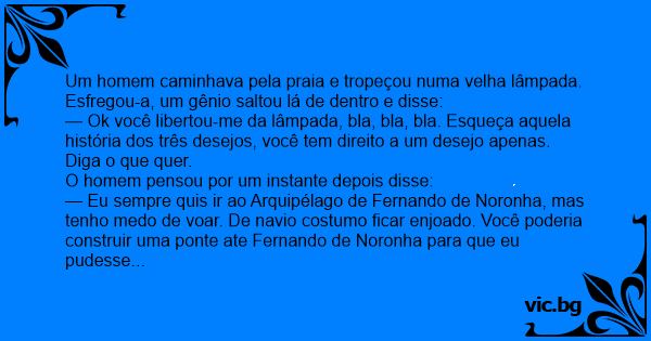 Um homem caminhava pela praia e tropeçou numa velha lâmpada. Esfregou-a, um gênio saltou lá de dentro e disse:
