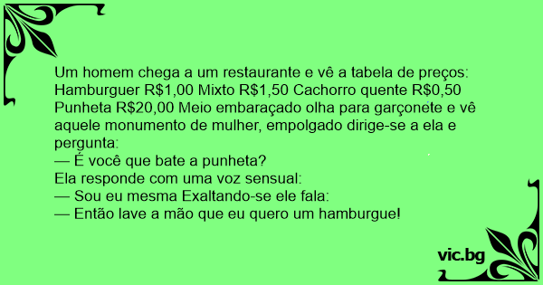 Hamburguer R$1,00 Mixto R$1,50 Сасhоrrо quente R$0,50 Рunhета R$20,00 Meio embaraçado olha para garçonete e vê aquele monumento de mulher, empolgado dirige-se a ela e pergunta: