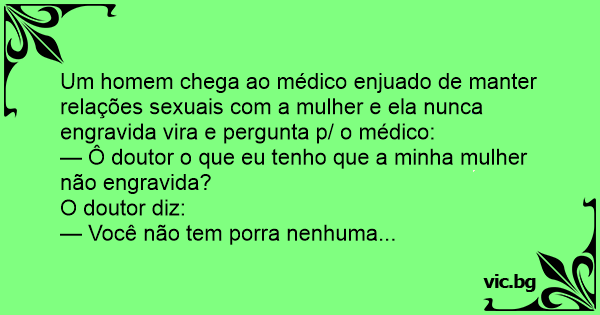Um homem chega ao médico enjuado de manter relações sexuais com a mulher e ela nunca engravida vira e pergunta p/ o médico: