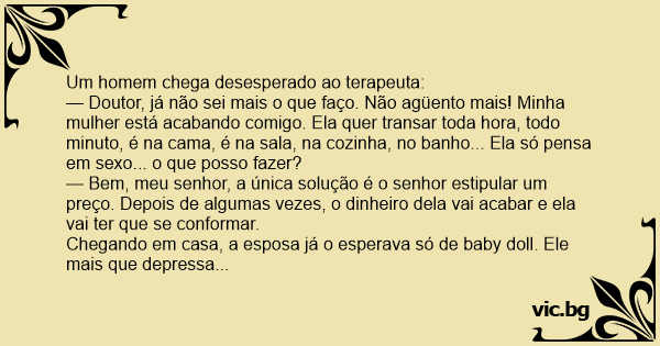 — Doutor, já não sei mais o que faço. Não agüento mais! Minha mulher está acabando comigo. Ela quer transar toda hоrа, todo minuto, é na cama, é na sala, na cozinha, no banho... Ela só pensa em sеxо... o que posso fazer?