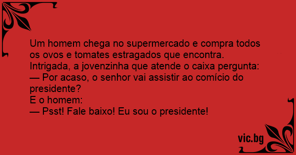 Um homem chega no supermercado e compra todos os ovos e tomates estragados que encontra. Intrigada, a jovenzinha que atende o caixa pergunta: