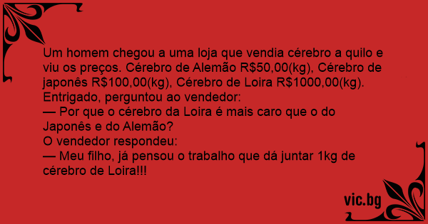 Um homem chegou a uma loja que vendia cérebro a quilo e viu os preços. Cérebro de Alemão R$50,00(kg), Cérebro de japonês R$100,00(kg), Cérebro de Loira R$1000,00(kg). Entrigado, perguntou ao vendedor: