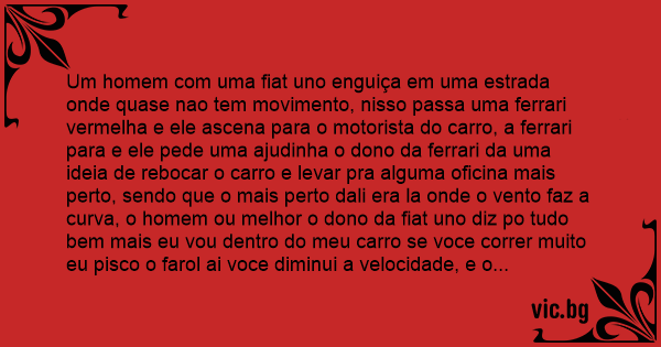 Um homem com uma fiat uno enguiça em uma estrada onde quase nao tem movimento, nisso passa uma ferrari vermelha e ele ascena para o motorista do carro, a ferrari para e ele pede uma ajudinha o dono da ferrari da uma ideia de rebocar o carro e levar pra alguma oficina mais perto, sendo que o mais perto dali era la onde o vento faz a curva, o homem ou melhor o dono da fiat uno diz po tudo bem mais eu vou dentro do meu carro se voce correr muito eu pisco o farol ai voce diminui a velocidade, e o dono da ferrari diz beleza entao, feito tudo isso eles fazendo uma viagem passa uma bmw ultimo ano cor preta, andando na mesma velocidade que a ferrari o dono desse carrao pergunta: