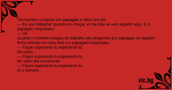 — Eu vou trabalhar quando eu chegar vc me fala se veio alguém aqui. E o papagaio respondeu: