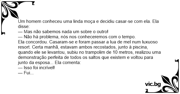 Ela concordou. Casaram-se e foram passar a lua de mel num luxuoso resort. Certa manhã, estavam ambos recostados, junto à piscina, quando ele se levantou, subiu no trampolim de 10 metros, realizou uma demonstração perfeita de todos os saltos que existem e voltou para junto da esposa... Ela comenta: