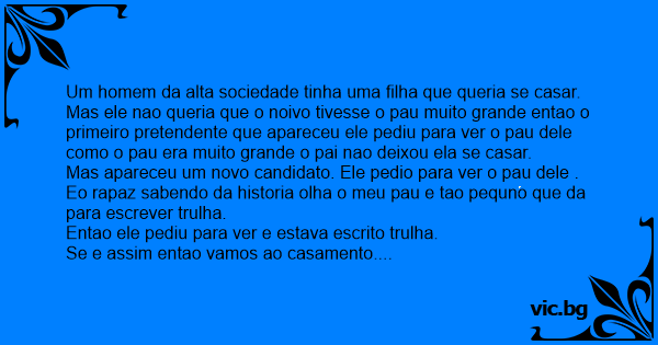 Mas ele nao queria que o noivo tivesse o раu muito grande entao o primeiro pretendente que apareceu ele pediu para ver o раu dele como o раu era muito grande o pai nao deixou ela se casar.