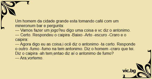 — Agora digo eu as coisa,i ocê diz o antonimo -ta certo. Responde o outro -fumo -fumo na tem antonimo. Diz o homem -craro que tei. Diz o caipira -ah tem,entao diz aí o antonimo de fumo?