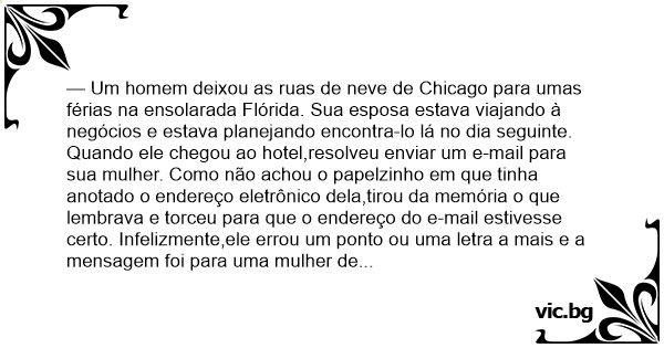 Quando ele chegou ao hotel,resolveu enviar um e-mail para sua mulher. Como não achou o papelzinho em que tinha anotado o endereço eletrônico dela,tirou da memória o que lembrava e torceu para que o endereço do e-mail estivesse certo. Infelizmente,ele errou um ponto ou uma letra a mais e a mensagem foi para uma mulher de um pastor.(esse pastor, tinha morrido no dia anterior). Quando ela foi checar seus e-mails de condolências,deu uma olhada no monitor, deu um grito de horror e caiu desmaiada no chão!Ao ouvir o grito, sua familia correu p/ o quarto,leu o seguinte no monitor: