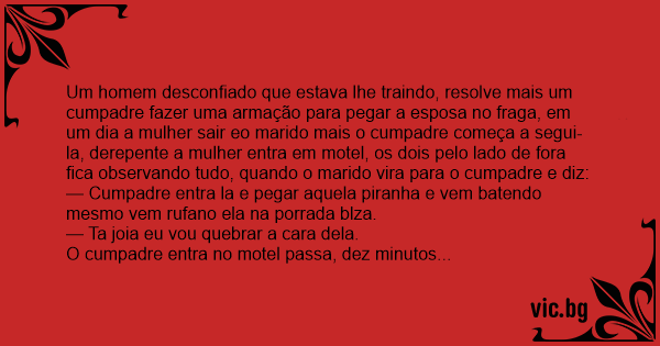 Um homem desconfiado que estava lhe traindo, resolve mais um cumpadre fazer uma armação para pegar a esposa no fraga, em um dia a mulher sair eo marido mais o cumpadre começa a segui-la, derepente a mulher entra em motel, os dois pelo lado de fora fiса observando tudo, quando o marido vira para o cumpadre e diz: