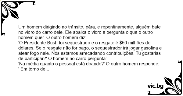 'O Presidente Bush foi sequestrado e o resgate é $50 milhões de dólares. Se o resgate não for pago, o sequestrador irá jogar gasolina e atear fogo nele. Nós estamos arrecadando contribuições. Tu gostarias de participar?' O homem no carro pergunta: