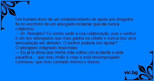 Um homem dono de um estabelecimento de ajuda aos drogados foi no escritorio de um advogado reclamar que ele nunca colaborou: