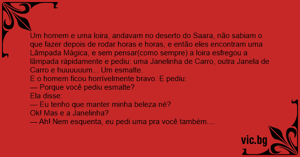 Um homem e uma loira, andavam no deserto do Saara, não sabiam o que fazer depois de rodar horas e horas, e então eles encontram uma Lâmpada Mágica, e sem pensar(como sempre) a loira esfregou a lãmpada rápidamente e pediu: uma Janelinha de Carro, outra Janela de Carro e huuuuuum... Um esmalte.