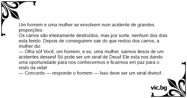 — Olha só! Você, um homem, e eu, uma mulher, saímos ilesos de um acidentes desses! Só pode ser um sinal de Deus! Ele esta nos dando uma oportunidade para nos conhecermos e ficarmos em paz para o resto da vida!
