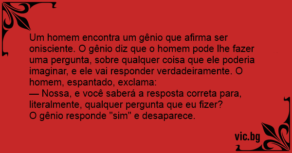 Um homem encontra um gênio que afirma ser onisciente. O gênio diz que o homem pode lhe fazer uma pergunta, sobre qualquer coisa que ele poderia imaginar, e ele vai responder verdadeiramente. O homem, espantado, exclama: