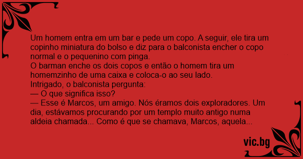 Um homem entra em um bar e pede um copo. A seguir, ele tira um copinho miniatura do bolso e diz para o balconista encher o copo normal e o pequenino com pinga.