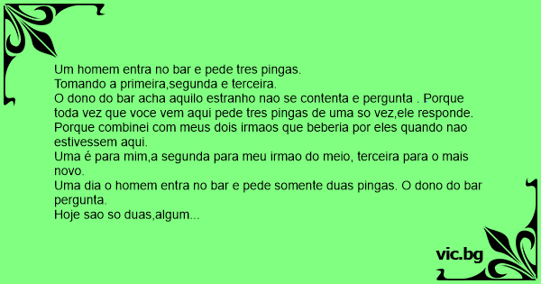 O dono do bar acha aquilo estranho nao se contenta e pergunta . Porque toda vez que voce vem aqui pede tres pingas de uma so vez,ele responde.