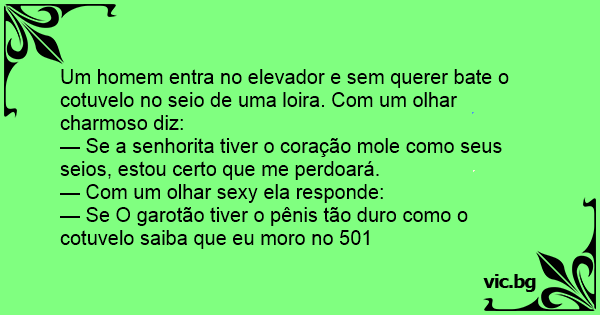 Um homem entra no elevador e sem querer bate o cotuvelo no seio de uma loira. Com um olhar charmoso diz: