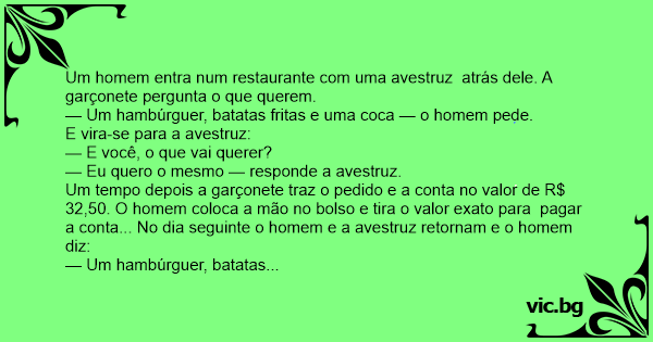 Um tempo depois a garçonete traz o pedido e a conta no valor de R$ 32,50. O homem coloca a mão no bolso e tira o valor exato para pagar a conta... No dia seguinte o homem e a avestruz retornam e o homem diz: