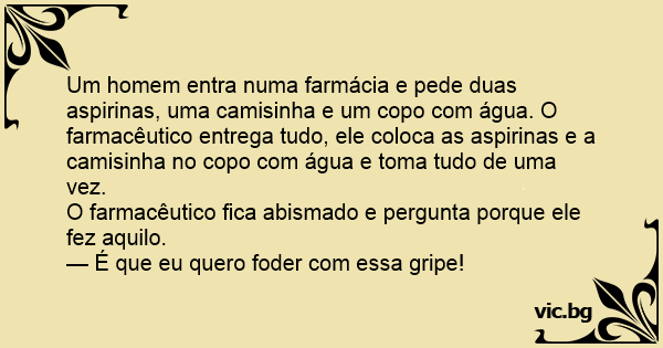 Um homem entra numa farmácia e pede duas aspirinas, uma camisinha e um copo com água. O farmacêutico entrega tudo, ele coloca as aspirinas e a camisinha no copo com água e toma tudo de uma vez.