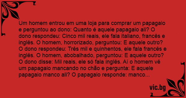 Um homem entrou em uma loja para comprar um papagaio e perguntou ao dono: Quanto é aquele papagaio ali? O dono respondeu: Cinco mil reais, ele fala italiano, francês e inglês. O homem, horrorizado, perguntou: E aquele outro? O dono respondeu: Três mil e quinhentos, ele fala francês e inglês. O homem, abobalhado, perguntou: E aquele outro? O dono disse: Mil reais, ele só fala inglês. Aí o homem vê um papagaio mancando no chão e pergunta: E aquele papagaio manco ali? O papagaio responde: manco é a sua avó, eu pisei no cocô do pato e vou ali lavar a pata, pô!