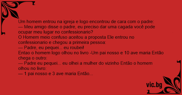 — Meu amigo disse o padre, eu preciso dar uma cagada você pode ocupar meu lugar no confessionario?