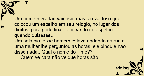 Um homem era taõ vaidoso, mas tão vaidoso que colocou um espelho em seu relogio, no lugar dos digitos, para pode ficar se olhando no espelho quando quisesse..