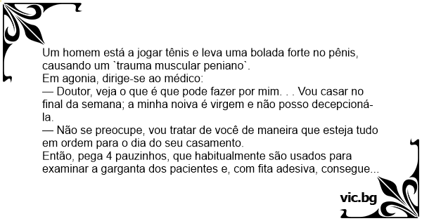 — Doutor, veja o que é que pode fazer por mim. . . Vou casar no final da semana; a minha noiva é virgem e não posso decepcioná-la.