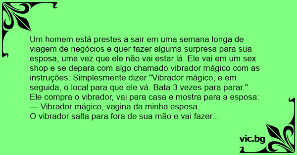 Um homem está prestes a sair em uma semana longa de viagem de negócios e quer fazer alguma surpresa para sua esposa, uma vez que ele não vai estar lá. Ele vai em um sеx shop e se depara com algo chamado vibrador mágico com as instruções: Simplesmente dizer "Vibrador mágico, e em seguida, o local para que ele vá. Bata 3 vezes para parar."