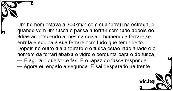 Um homem estava a 300km/h com sua ferrari na estrada, e quando vem um fusca e passa a ferrari com tudo depois de 3dias acontecendo a mesma coisa o homem da ferrare se enrrita e equipa a sua ferrare com tudo que tem direito.
