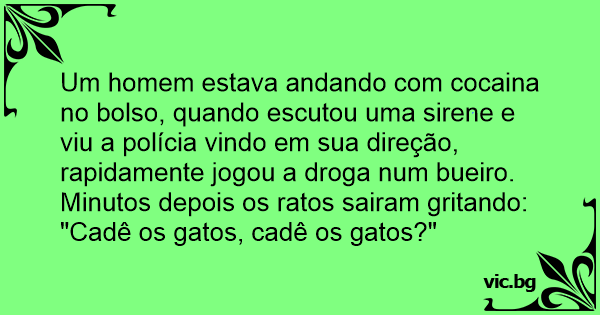 Um homem estava andando com cocaina no bolso, quando escutou uma sirene e viu a polícia vindo em sua direção, rapidamente jogou a droga num bueiro. Minutos depois os ratos sairam gritando: