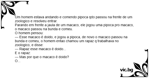 — Esse macaco é doido, e jogou a pipoca, de novo o macaco passou na bunda e comeu, o homem entao chamou um rapaz q trabalhava no zoologico, e disse: