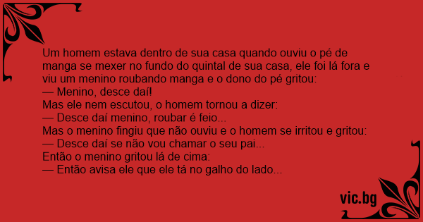 Um homem estava dentro de sua casa quando ouviu o pé de manga se mexer no fundo do quintal de sua casa, ele foi lá fora e viu um menino roubando manga e o dono do pé gritou: